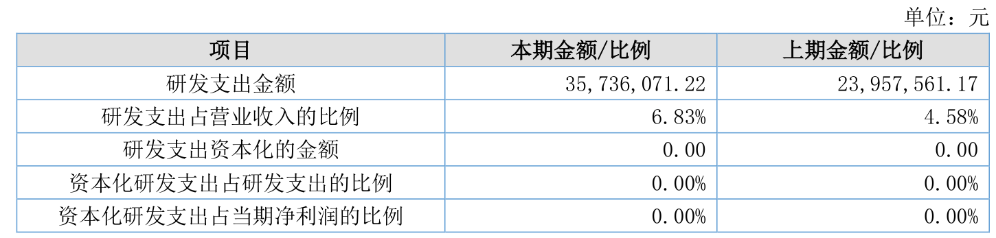 2025年全年,公司研发投入金额为3573.61万元,同比增长49.16%;研发投入占营业收入比例为6.83%,相比上年同期上升2.25个百分点。此外,公司全年研发投入资本化率为0%。