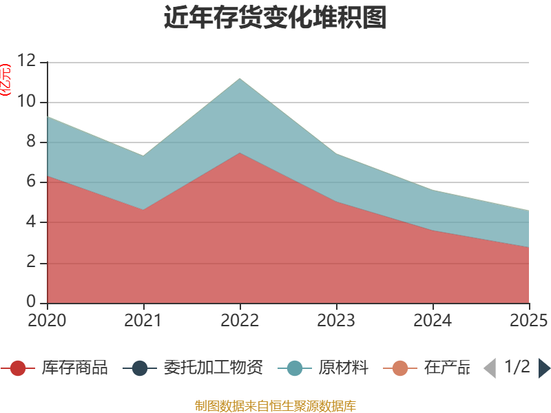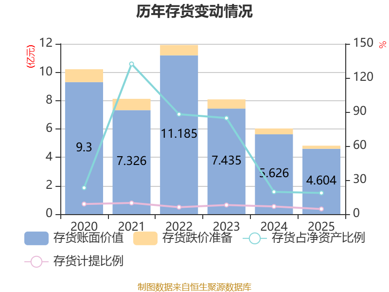 从存货变动来看,截至2025年末,公司存货账面价值为4.6亿元,占净资产的18.64%,较上年末减少1.02亿元。其中,存货跌价准备为2189.87万元,计提比例为4.54%。