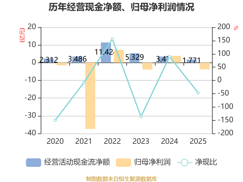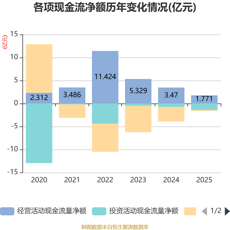 截至2025年,公司经营活动现金流净额为1.77亿元,同比下降48.96%;筹资活动现金流净额-2056.3万元,同比增加2.96亿元;投资活动现金流净额-1.41亿元,上年同期为-7353.46万元。