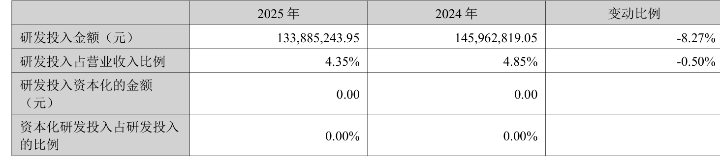 2025年全年,公司研发投入金额为1.34亿元,同比下降8.27%;研发投入占营业收入比例为4.35%,相比上年同期下降0.5个百分点。此外,公司全年研发投入资本化率为0%。