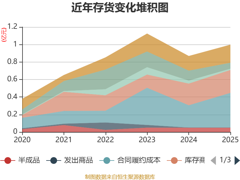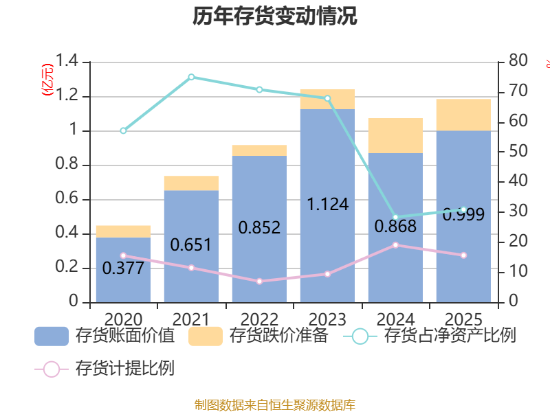 从存货变动来看,截至2025年末,公司存货账面价值为9987.58万元,占净资产的30.81%,较上年末增加1307.08万元。其中,存货跌价准备为1842.8万元,计提比例为15.58%。