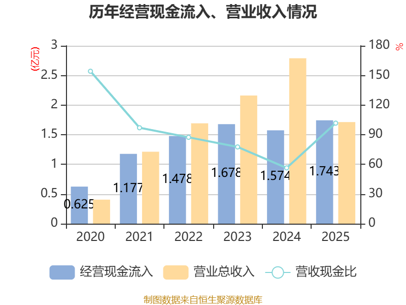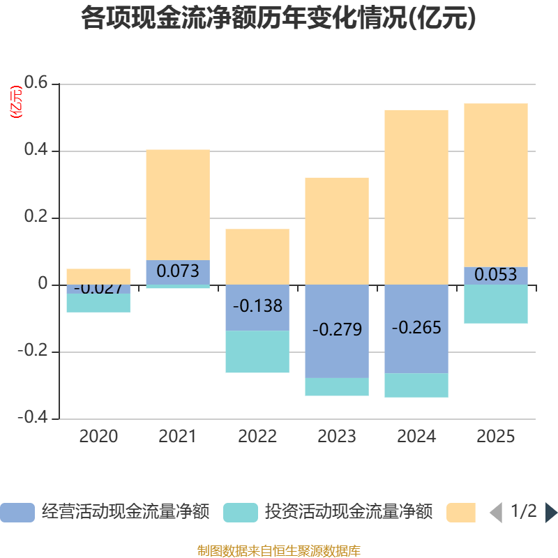 截至2025年,公司经营活动现金流净额为530.58万元,同比增加3181.98万元;筹资活动现金流净额4880.67万元,同比减少330.86万元;投资活动现金流净额-1156.93万元,上年同期为-721.41万元。