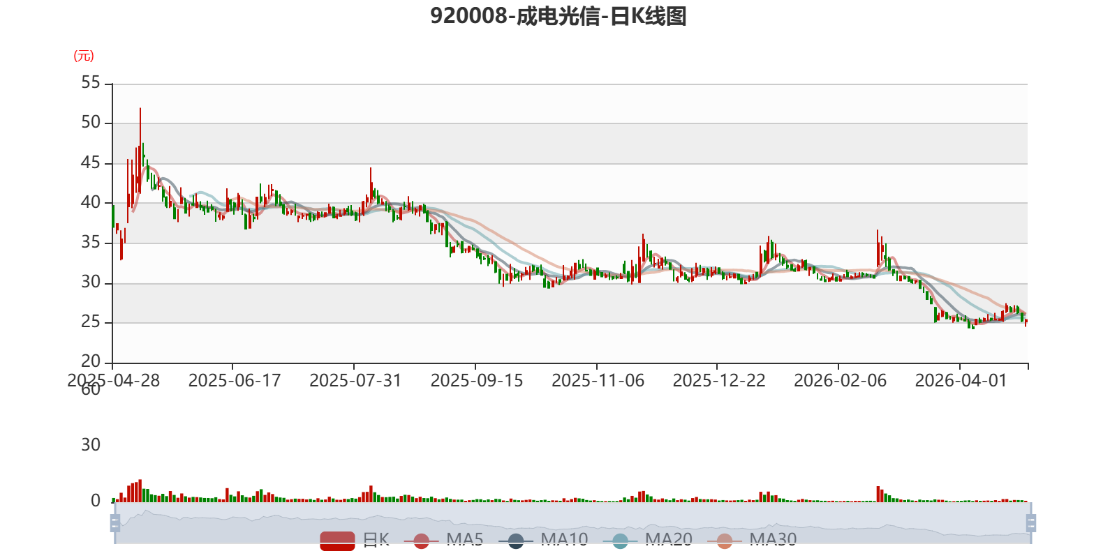 中证智能财讯成电光信(920008)4月27日披露2025年年度报告。2025年,公司实现营业总收入1.71亿元,同比下降38.57%;归母净利润1621.46万元,同比下降67.76%;扣非净利润1561.1万元,同比下降66.71%;经营活动产生的现金流量净额为530.58万元,上年同期为-2651.4万元;报告期内,成电光信基本每股收益为0.2543元,加权平均净资产收益率为5.14%。公司2025年度分配预案为:拟向全体股东每10股派现0.8元(含税)。