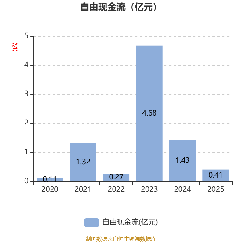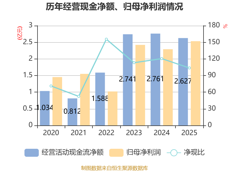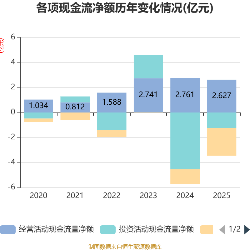 截至2025年,公司经营活动现金流净额为2.63亿元,同比下降4.84%;筹资活动现金流净额-2.22亿元,同比减少1.04亿元;投资活动现金流净额-1.23亿元,上年同期为-4.54亿元。