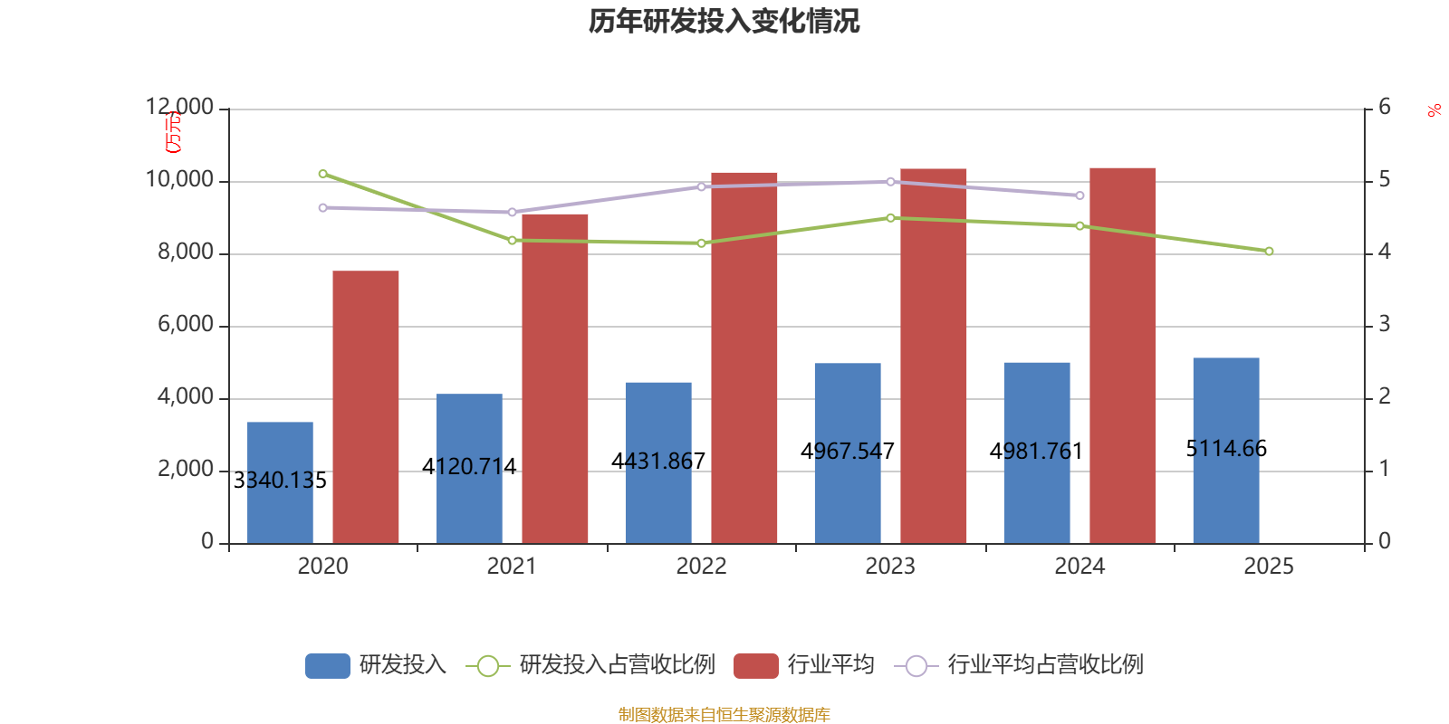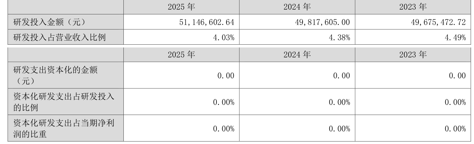 2025年全年,公司研发投入金额为5114.66万元,同比增长2.67%;研发投入占营业收入比例为4.03%,相比上年同期下降0.35个百分点。此外,公司全年研发投入资本化率为0%。