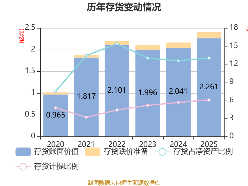 从存货变动来看,截至2025年末,公司存货账面价值为2.26亿元,占净资产的12.99%,较上年末增加2205.25万元。其中,存货跌价准备为1455.78万元,计提比例为6.05%。