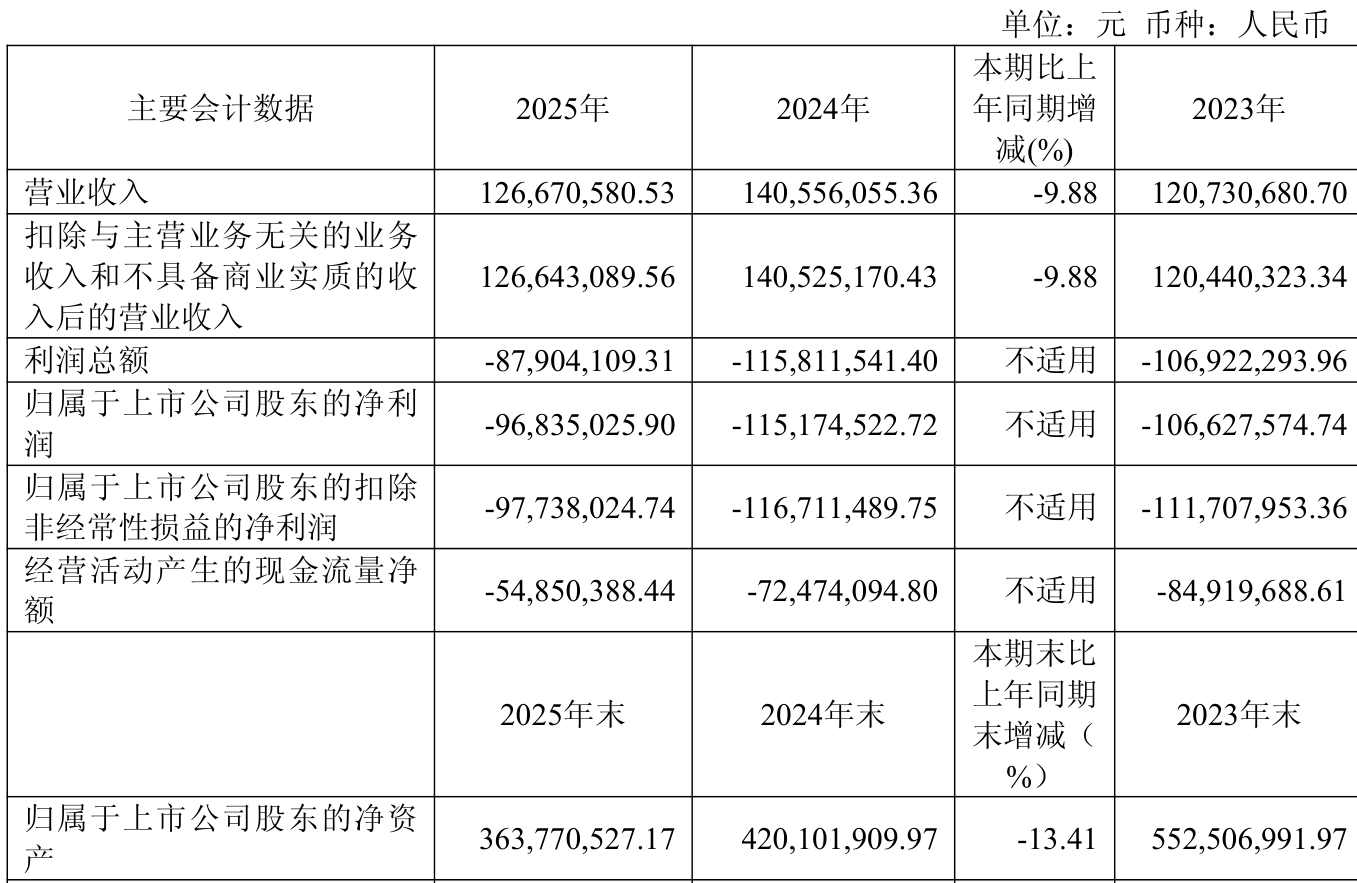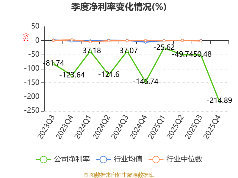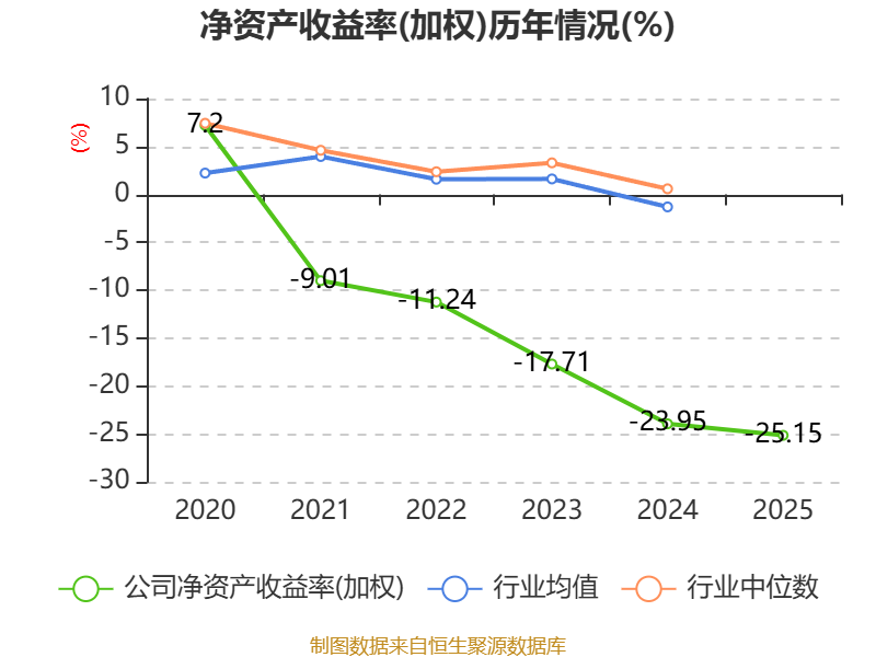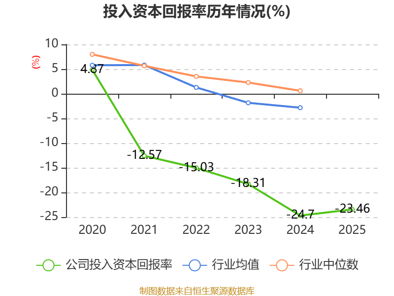 数据显示,2025年公司加权平均净资产收益率为-25.15%,较上年同期下降1.2个百分点。公司2025年投入资本回报率为-23.46%,较上年同期上升1.24个百分点。