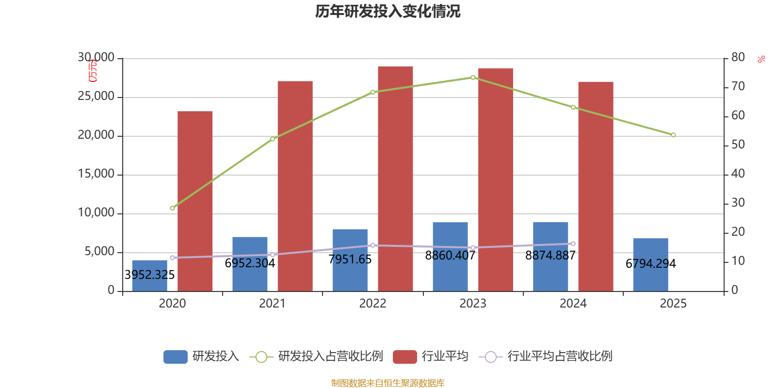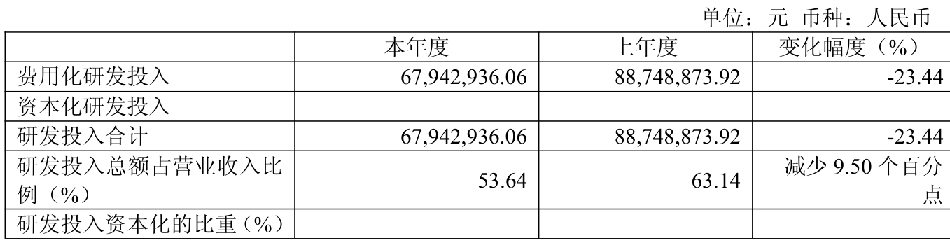 2025年全年,公司研发投入金额为6794.29万元,同比下降23.44%;研发投入占营业收入比例为53.64%,相比上年同期下降9.5个百分点。