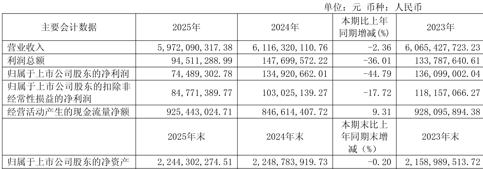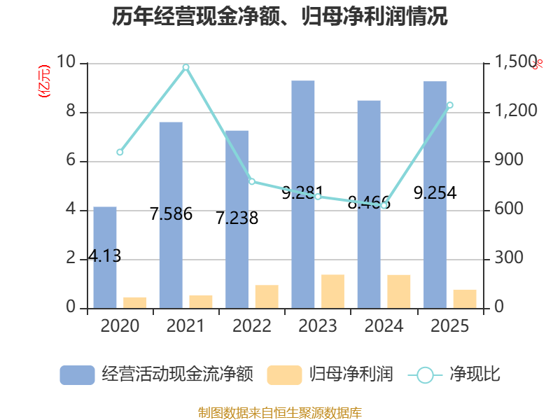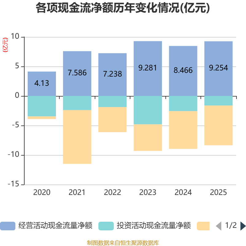 截至2025年,公司经营活动现金流净额为9.25亿元,同比增长9.31%;筹资活动现金流净额-6.74亿元,同比减少3394.36万元;投资活动现金流净额-1.62亿元,上年同期为-2.57亿元。