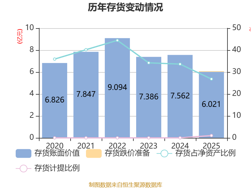 从存货变动来看,截至2025年末,公司存货账面价值为6.02亿元,占净资产的26.83%,较上年末减少1.54亿元。其中,存货跌价准备为644.49万元,计提比例为1.06%。