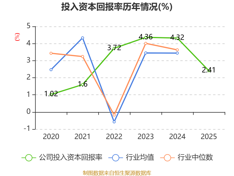 数据显示,2025年公司加权平均净资产收益率为3.3%,较上年同期下降2.82个百分点。公司2025年投入资本回报率为2.41%,较上年同期下降1.91个百分点。