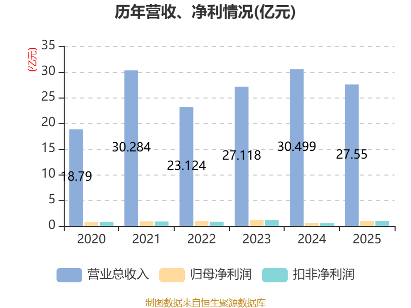 中证智能财讯长华化学(301518)4月28日披露2025年年度报告。2025年,公司实现营业总收入27.55亿元,同比下降9.67%;归母净利润9721.81万元,同比增长67.17%;扣非净利润9444.6万元,同比增长80.39%;经营活动产生的现金流量净额为1.3亿元,同比增长94.89%;报告期内,长华化学基本每股收益为0.69元,加权平均净资产收益率为6.66%。公司2025年度分配预案为:拟向全体股东每10股派现2.69元(含税)。
