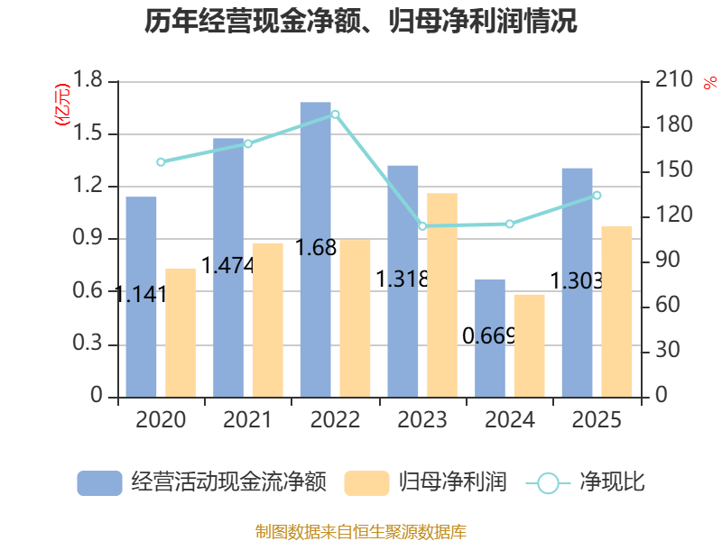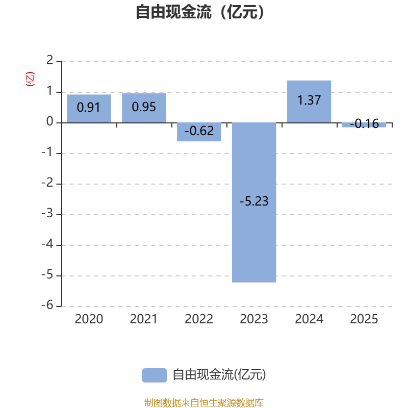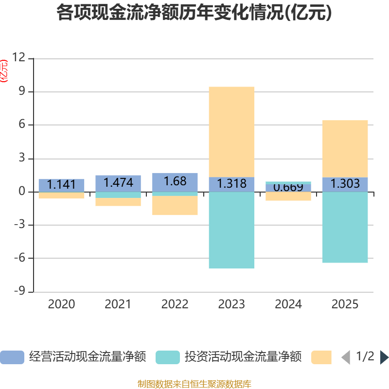截至2025年,公司经营活动现金流净额为1.3亿元,同比增长94.89%;筹资活动现金流净额5.13亿元,同比增加5.93亿元;投资活动现金流净额-6.39亿元,上年同期为2422.42万元。