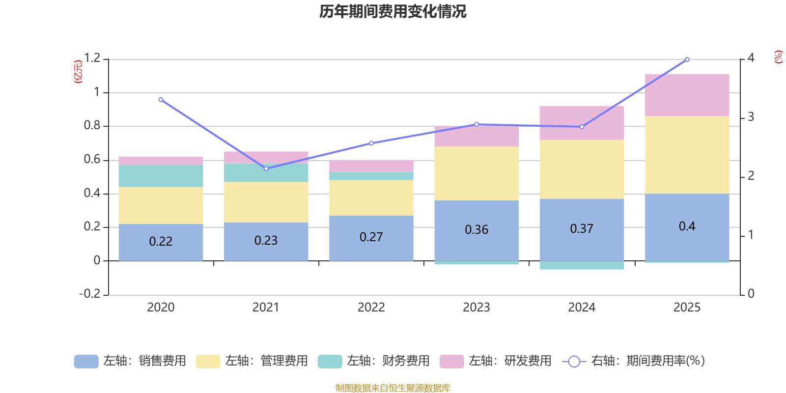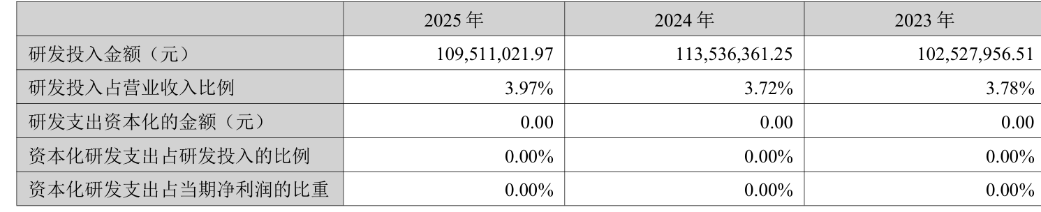 2025年全年,公司研发投入金额为1.1亿元,同比下降3.55%;研发投入占营业收入比例为3.97%,相比上年同期上升0.25个百分点。此外,公司全年研发投入资本化率为0%。