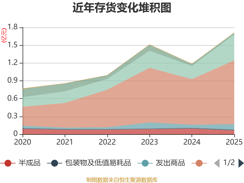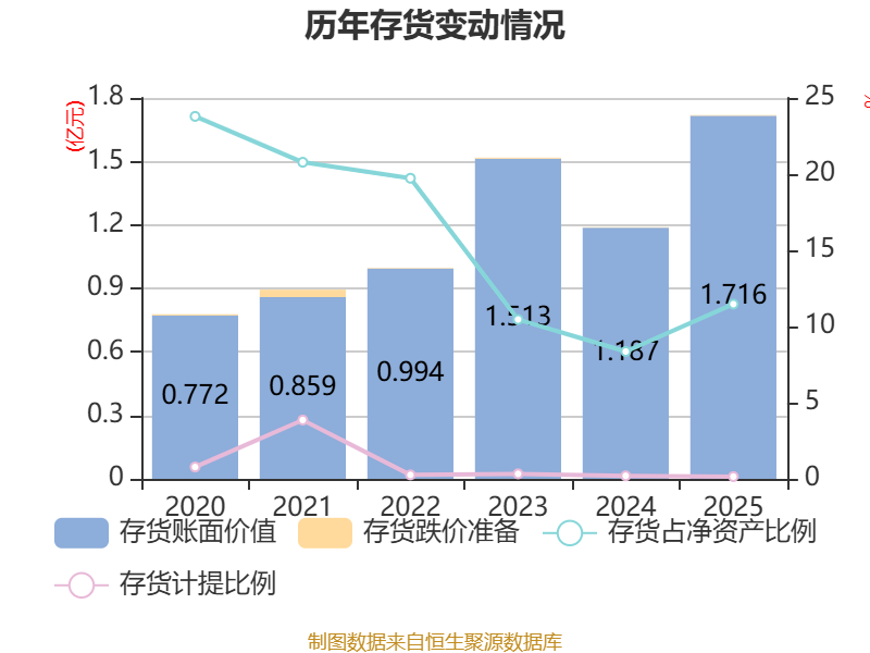 从存货变动来看,截至2025年末,公司存货账面价值为1.72亿元,占净资产的11.47%,较上年末增加5284.62万元。其中,存货跌价准备为26.3万元,计提比例为0.15%。