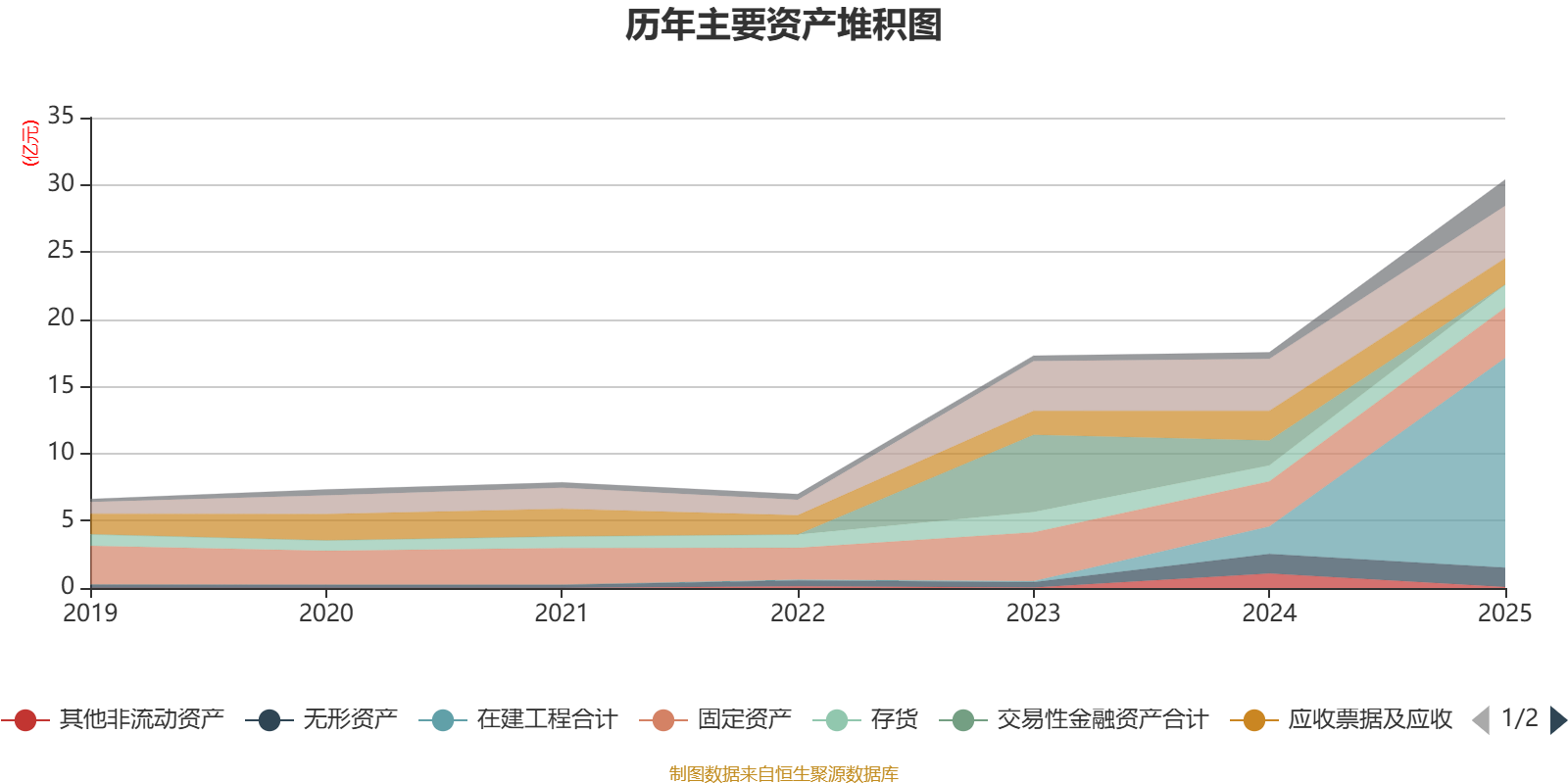 资产重大变化方面,截至2025年末,公司在建工程合计较上年末增加660.77%,占公司总资产比重上升39.65个百分点;交易性金融资产合计较上年末减少100%,占公司总资产比重下降10.57个百分点;货币资金较上年末增加1.1%,占公司总资产比重下降9.17个百分点;固定资产较上年末增加11.88%,占公司总资产比重下降6.77个百分点。