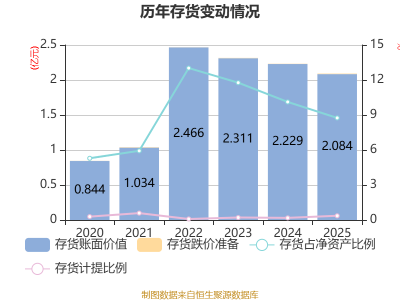 从存货变动来看,截至2025年末,公司存货账面价值为2.08亿元,占净资产的8.75%,较上年末减少1443.41万元。其中,存货跌价准备为75.85万元,计提比例为0.36%。