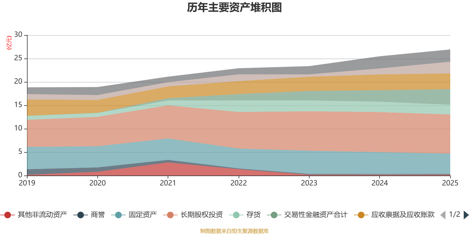 资产重大变化方面,截至2025年末,公司货币资金较上年末增加95%,占公司总资产比重上升4.24个百分点;交易性金融资产合计较上年末增加36.74%,占公司总资产比重上升2.81个百分点;长期股权投资较上年末减少2.26%,占公司总资产比重下降2.54个百分点;固定资产较上年末减少6.89%,占公司总资产比重下降2.2个百分点。