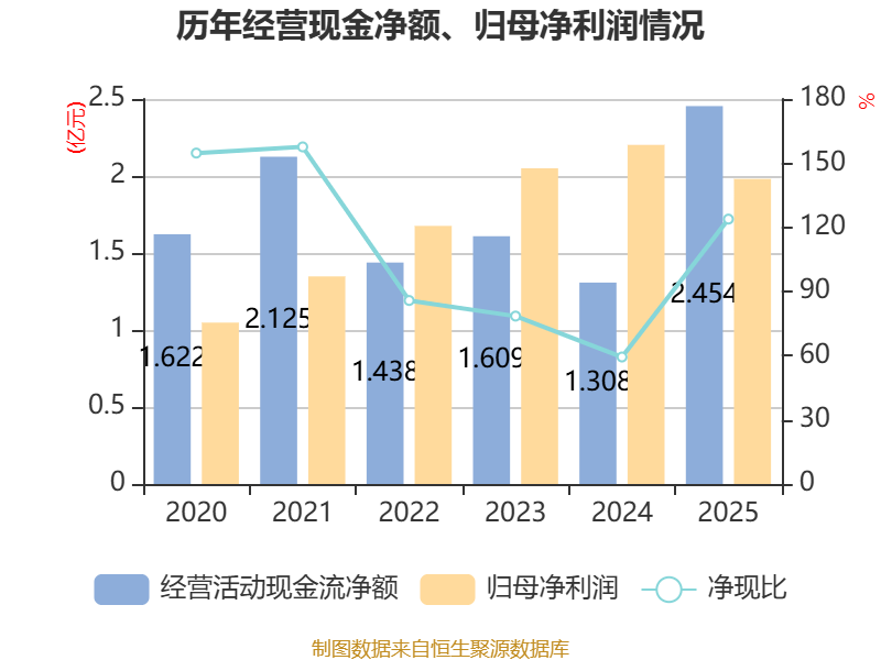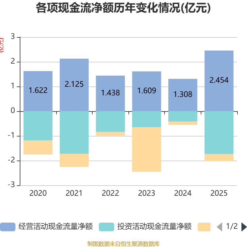 截至2025年,公司经营活动现金流净额为2.45亿元,同比增长87.62%;筹资活动现金流净额-2866.77万元,同比减少1549.55万元;投资活动现金流净额-1.74亿元,上年同期为-4219.02万元。