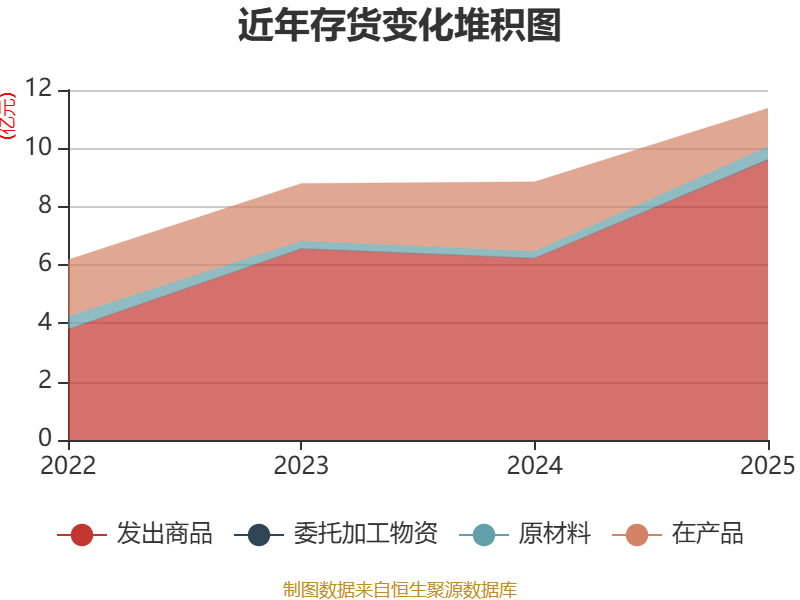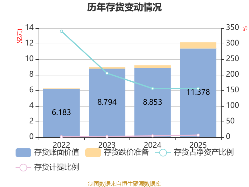 从存货变动来看,截至2025年末,公司存货账面价值为11.38亿元,占净资产的155.76%,较上年末增加2.53亿元。其中,存货跌价准备为7909.23万元,计提比例为6.5%。