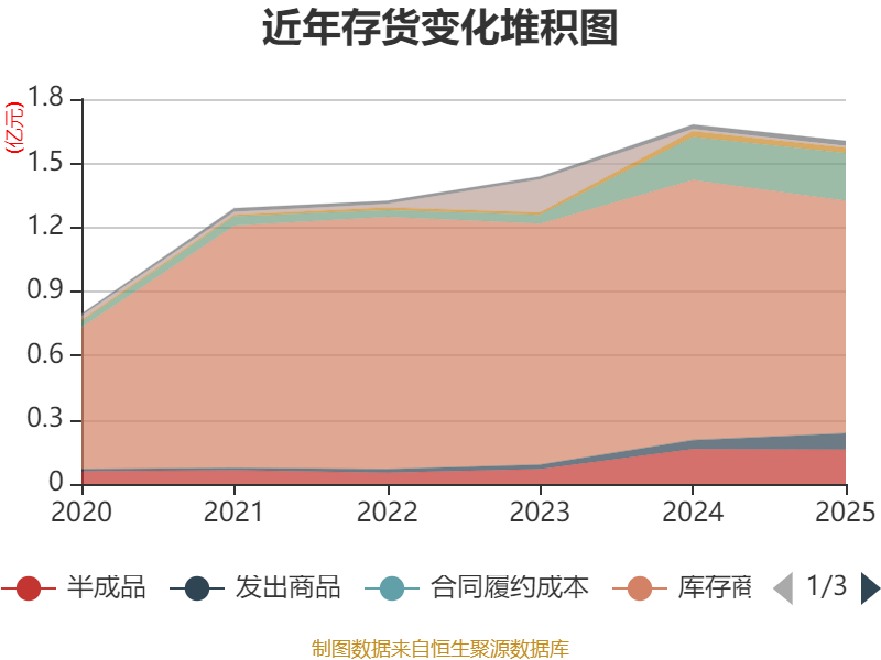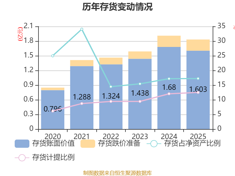 从存货变动来看,截至2025年末,公司存货账面价值为1.6亿元,占净资产的17.23%,较上年末减少770.15万元。其中,存货跌价准备为2288.44万元,计提比例为12.49%。