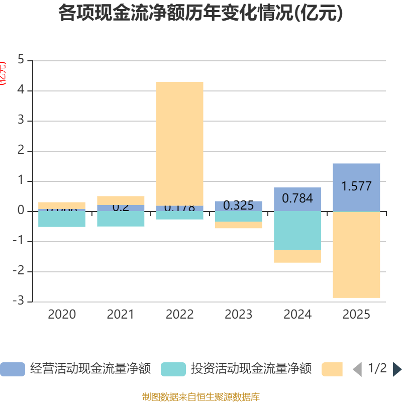 截至2025年,公司经营活动现金流净额为1.58亿元,同比增长101.13%;筹资活动现金流净额-2.85亿元,同比减少2.43亿元;投资活动现金流净额-285.65万元,上年同期为-1.28亿元。