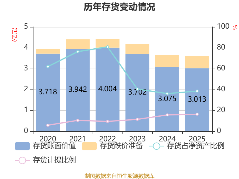 从存货变动来看,截至2025年末,公司存货账面价值为3.01亿元,占净资产的38.49%,较上年末减少615.9万元。其中,存货跌价准备为5898.66万元,计提比例为16.37%。