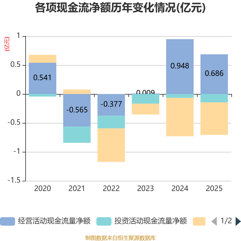 截至2025年,公司经营活动现金流净额为6858.58万元,同比下降27.68%;筹资活动现金流净额-5625.76万元,同比增加1010.02万元;投资活动现金流净额-1448.12万元,上年同期为-668.27万元。