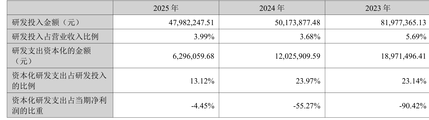 2025年全年,公司研发投入金额为4798.22万元,同比下降4.37%;研发投入占营业收入比例为3.99%,相比上年同期上升0.31个百分点。此外,公司全年研发投入资本化率为13.12%。