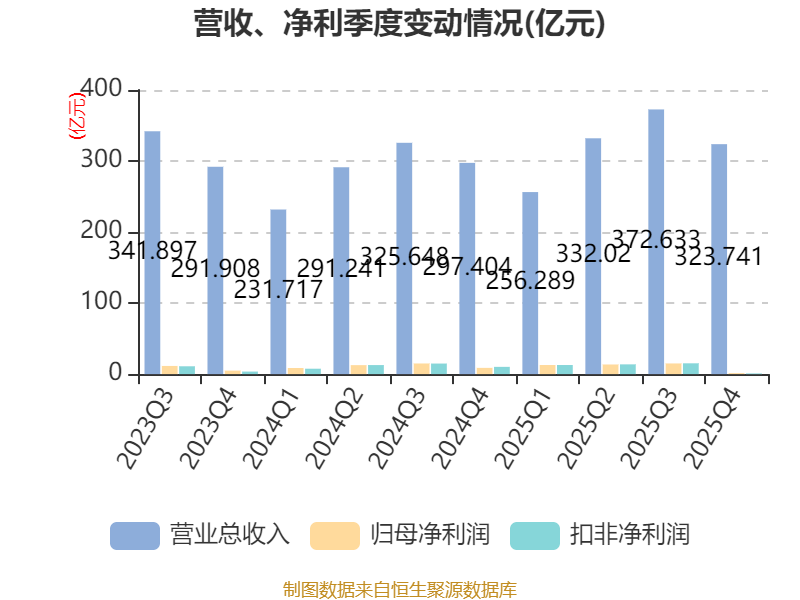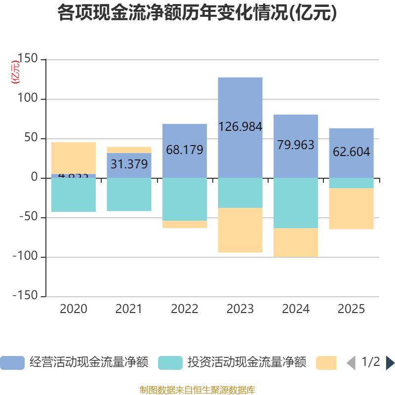 截至2025年,公司经营活动现金流净额为62.6亿元,同比下降21.71%;筹资活动现金流净额-51.76亿元,同比减少15.65亿元;投资活动现金流净额-13.42亿元,上年同期为-64.06亿元。