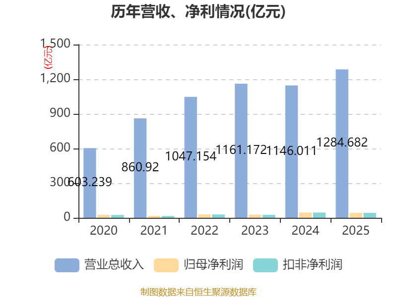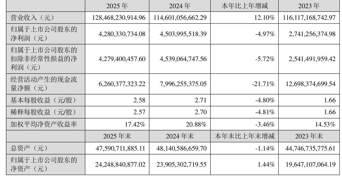 中证智能财讯海大集团(002311)4月28日披露2025年年度报告。2025年,公司实现营业总收入1284.68亿元,同比增长12.10%;归母净利润42.8亿元,同比下降4.97%;扣非净利润42.79亿元,同比下降5.72%;经营活动产生的现金流量净额为62.6亿元,同比下降21.71%;报告期内,海大集团基本每股收益为2.58元,加权平均净资产收益率为17.42%。公司2025年度分配预案为:拟向全体股东每10股派现11元(含税)。