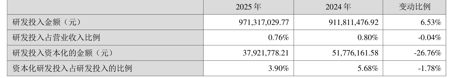 2025年全年,公司研发投入金额为9.71亿元,同比增长6.53%;研发投入占营业收入比例为0.76%,相比上年同期下降0.04个百分点。此外,公司全年研发投入资本化率为3.9%。