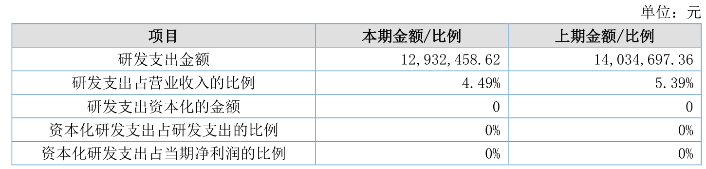2025年全年,公司研发投入金额为1293.25万元,同比下降7.85%;研发投入占营业收入比例为4.49%,相比上年同期下降0.9个百分点。此外,公司全年研发投入资本化率为0%。