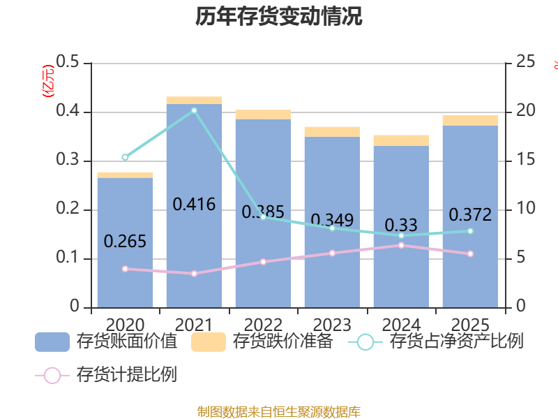 从存货变动来看,截至2025年末,公司存货账面价值为3717.32万元,占净资产的7.8%,较上年末增加413.74万元。其中,存货跌价准备为214.92万元,计提比例为5.47%。