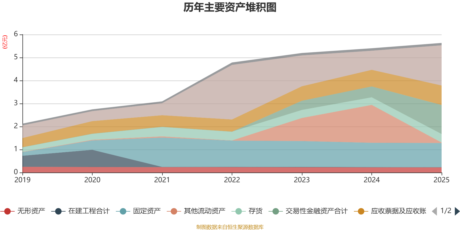 资产重大变化方面,截至2025年末,公司其他流动资产较上年末减少98.93%,占公司总资产比重下降30.19个百分点;货币资金较上年末增加109.93%,占公司总资产比重上升15.65个百分点;交易性金融资产合计较上年末增加167.4%,占公司总资产比重上升13.68个百分点;应收票据及应收账款较上年末增加17.46%,占公司总资产比重上升1.69个百分点。
