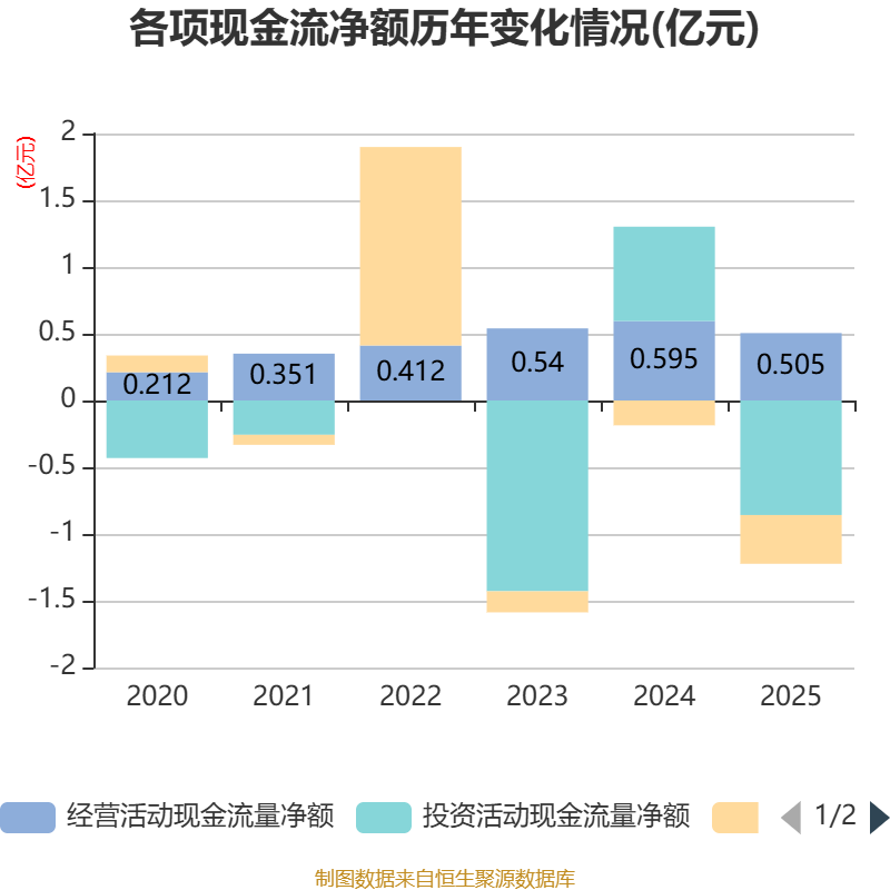 截至2025年,公司经营活动现金流净额为5049.58万元,同比下降15.07%;筹资活动现金流净额-3645.65万元,同比减少1787万元;投资活动现金流净额-8580.15万元,上年同期为7068.47万元。