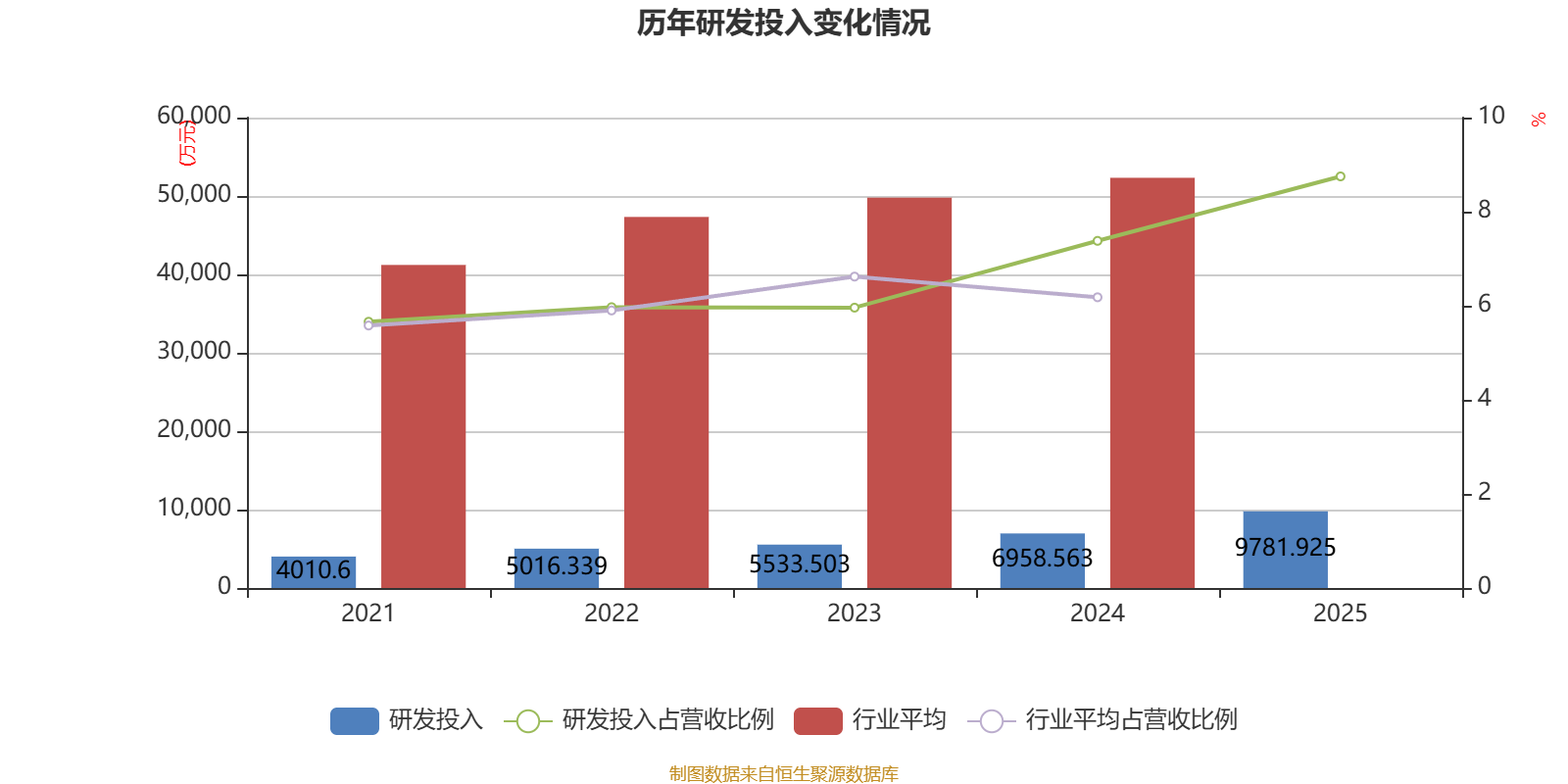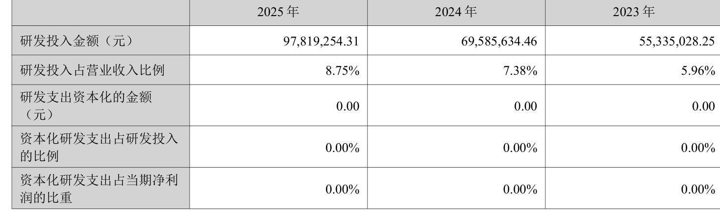 2025年全年,公司研发投入金额为9781.93万元,同比增长40.57%;研发投入占营业收入比例为8.75%,相比上年同期上升1.37个百分点。此外,公司全年研发投入资本化率为0%。