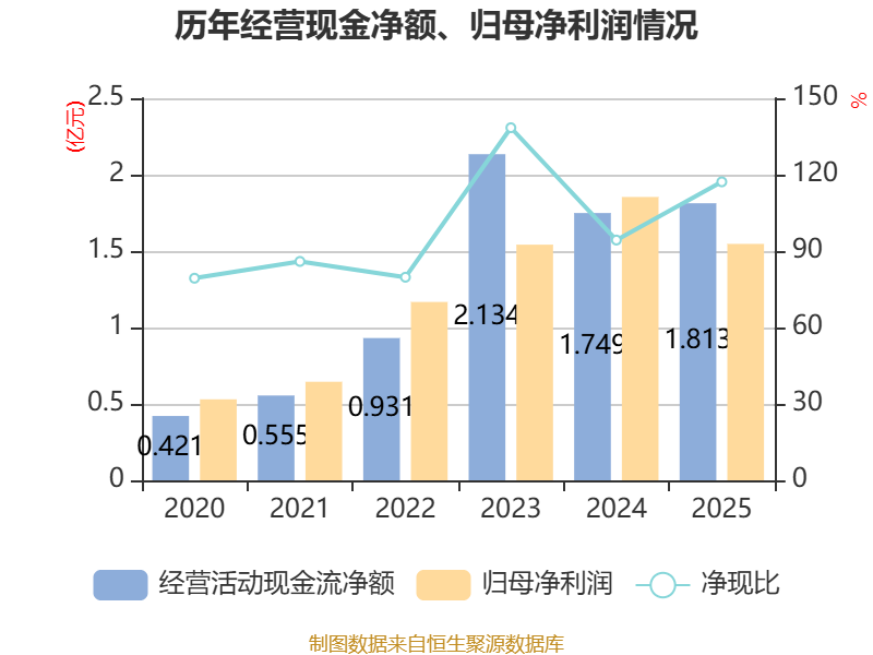 截至2025年,公司经营活动现金流净额为1.81亿元,同比增长3.64%;筹资活动现金流净额-6169.81万元,同比减少5.46亿元;投资活动现金流净额-1.6亿元,上年同期为-5.4亿元。