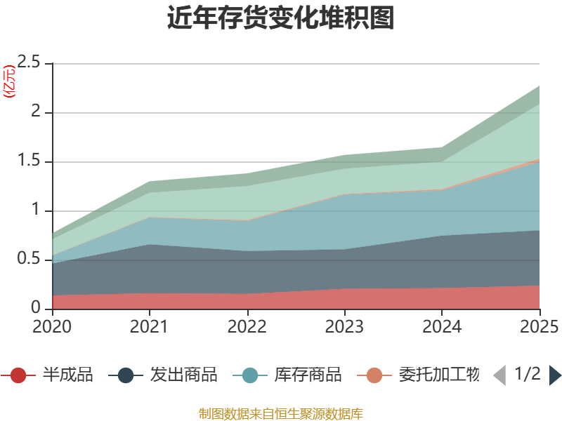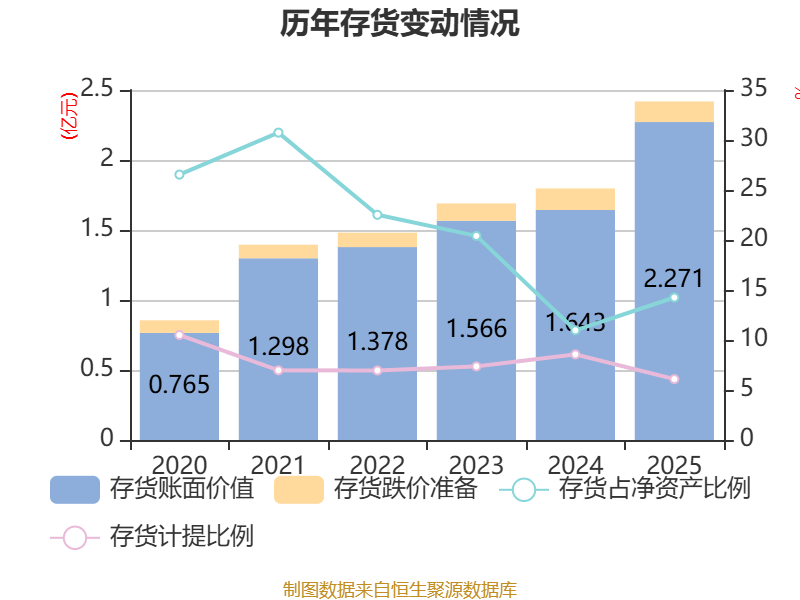 从存货变动来看,截至2025年末,公司存货账面价值为2.27亿元,占净资产的14.25%,较上年末增加6273.37万元。其中,存货跌价准备为1473.2万元,计提比例为6.09%。