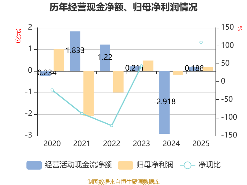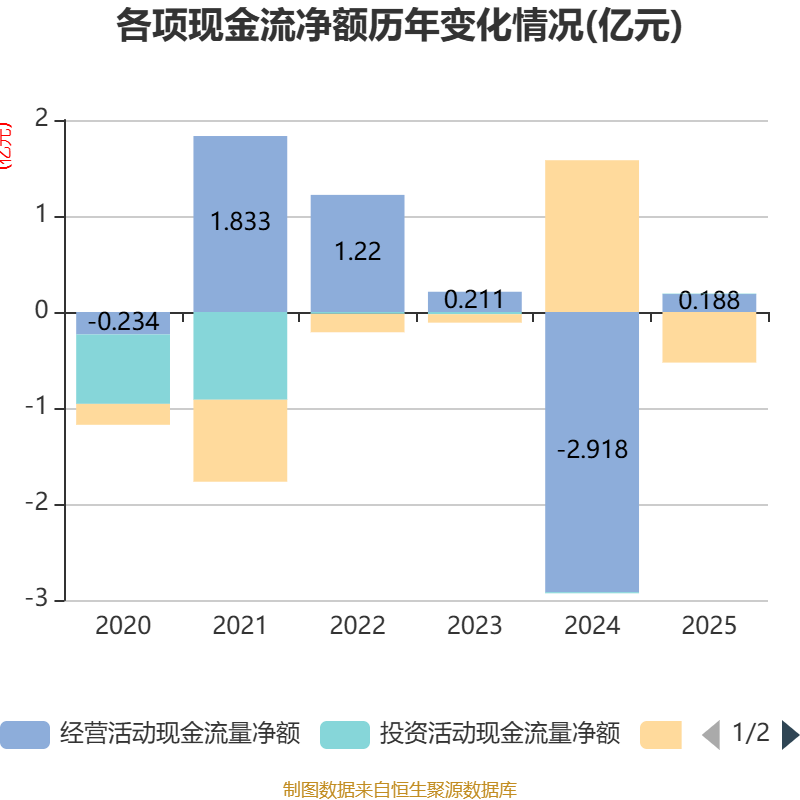 截至2025年,公司经营活动现金流净额为1880.42万元,同比增加3.11亿元;筹资活动现金流净额-5273.08万元,同比减少2.11亿元;投资活动现金流净额54.56万元,上年同期为-124.52万元。