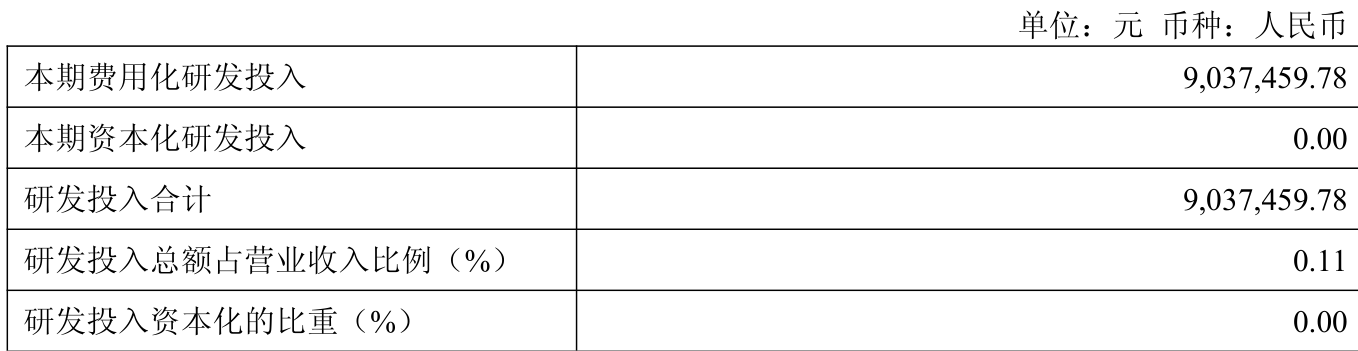 2025年全年,公司研发投入金额为903.75万元,同比下降8.54%;研发投入占营业收入比例为0.11%,相比上年同期下降0.05个百分点。此外,公司全年研发投入资本化率为0%。