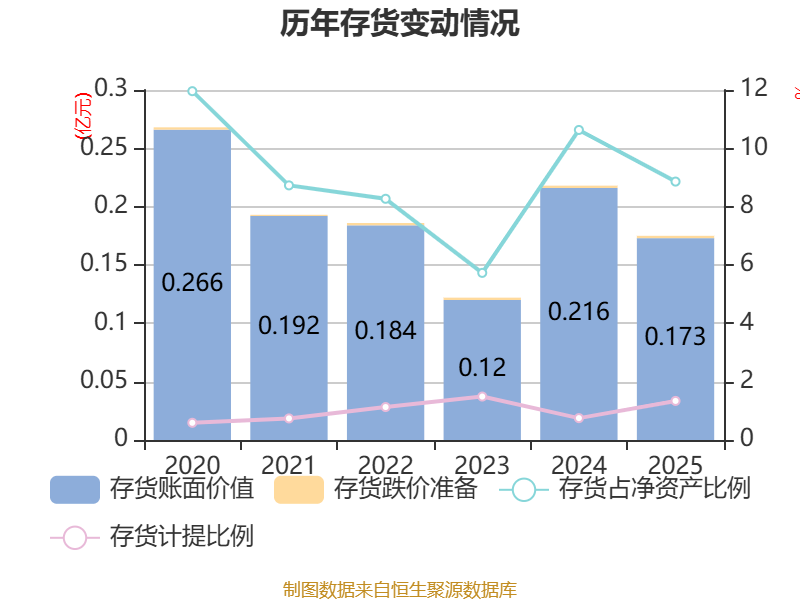 从存货变动来看,截至2025年末,公司存货账面价值为1728.11万元,占净资产的8.86%,较上年末减少430.45万元。其中,存货跌价准备为23.41万元,计提比例为1.34%。