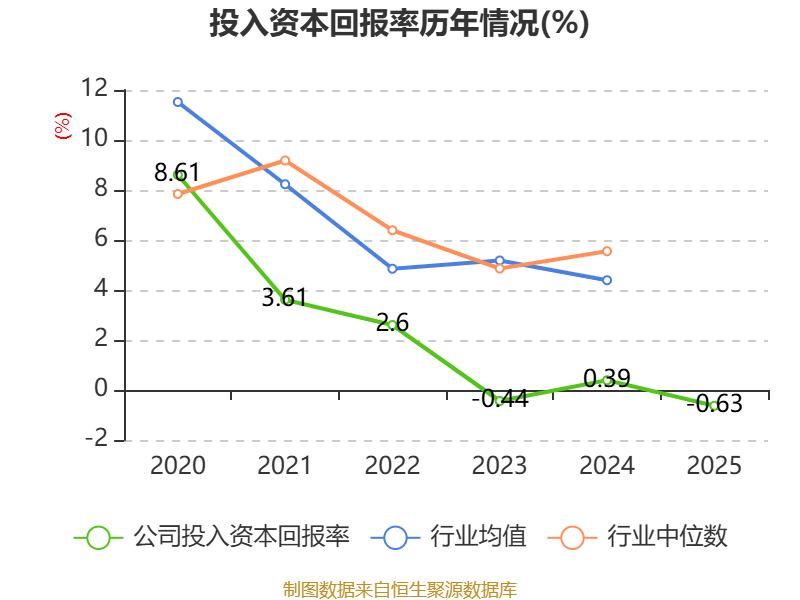数据显示,2025年公司加权平均净资产收益率为1.06%,较上年同期下降1.04个百分点。公司2025年投入资本回报率为-0.63%,较上年同期下降1.02个百分点。