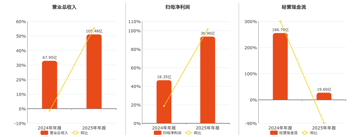 公司营业总收入为105.48亿元,在已披露的同业公司中排名第17,较去年同报告期营业总收入增加39.50亿元,同比较去年同期上涨59.86%。归母净利润为36.96亿元,在已披露的同业公司中排名第15,较去年同报告期归母净利润增加18.61亿元,实现3年连续上涨,同比较去年同期上涨101.44%。经营活动现金净流入为19.60亿元。