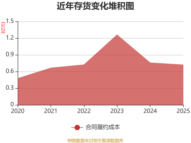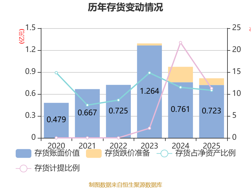从存货变动来看,截至2025年末,公司存货账面价值为7233.73万元,占净资产的10.84%,较上年末减少379.51万元。其中,存货跌价准备为919.82万元,计提比例为11.28%。