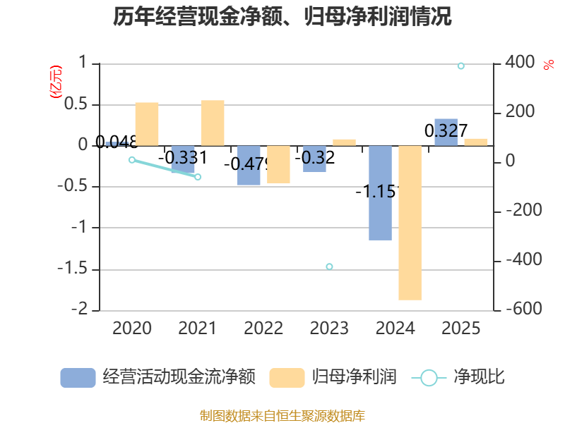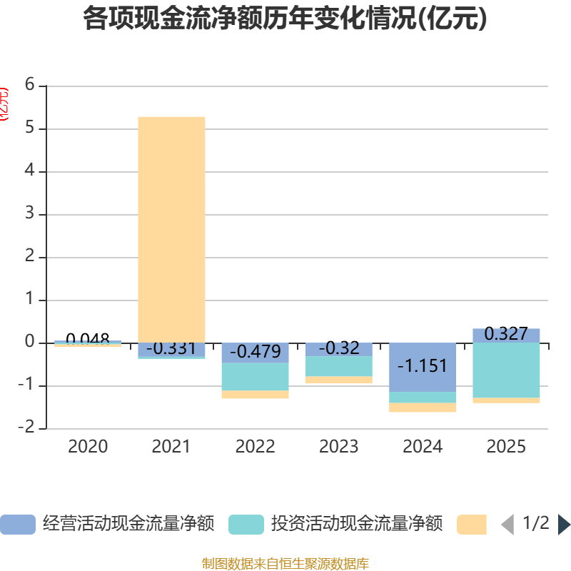 截至2025年,公司经营活动现金流净额为3271.28万元,同比增加1.48亿元;筹资活动现金流净额-1207.22万元,同比增加908.58万元;投资活动现金流净额-1.29亿元,上年同期为-2602.46万元。