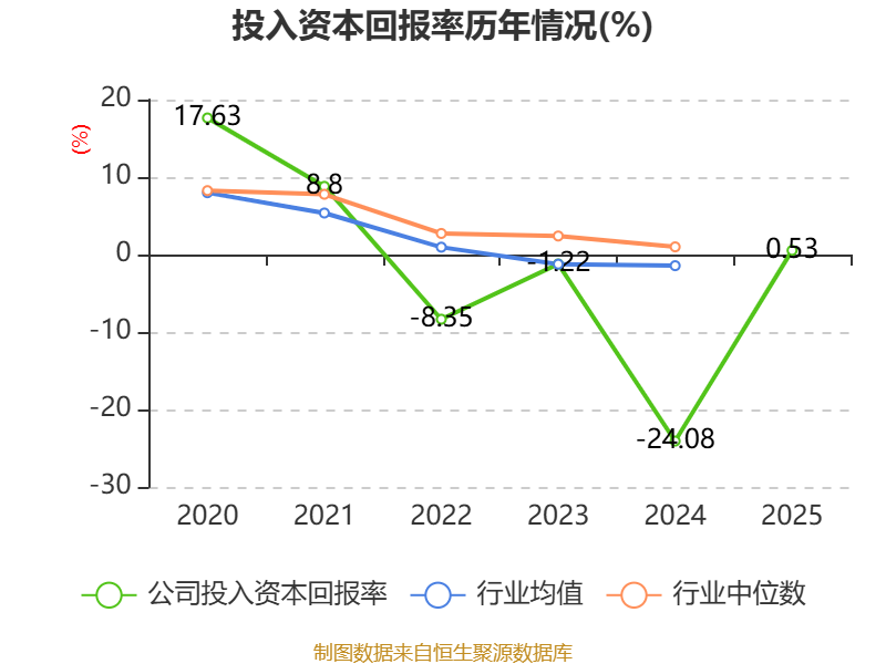 数据显示,2025年公司加权平均净资产收益率为1.27%,较上年同期上升26.09个百分点。公司2025年投入资本回报率为0.53%,较上年同期上升24.61个百分点。