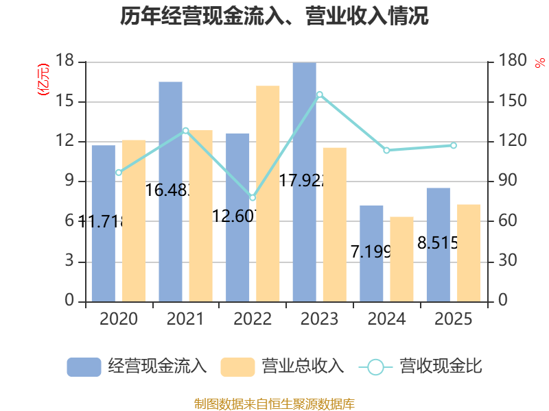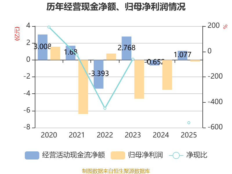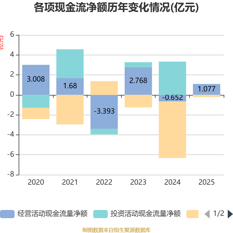 截至2025年,公司经营活动现金流净额为1.08亿元,同比增加1.73亿元;筹资活动现金流净额-2240.5万元,同比增加5.44亿元;投资活动现金流净额235.21万元,上年同期为3.33亿元。