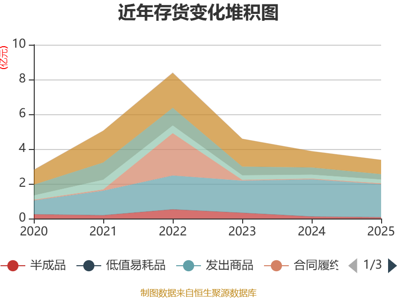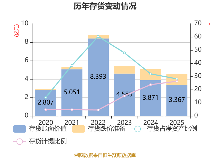 从存货变动来看,截至2025年末,公司存货账面价值为3.37亿元,占净资产的28.1%,较上年末减少5041.86万元。其中,存货跌价准备为1.2亿元,计提比例为26.27%。