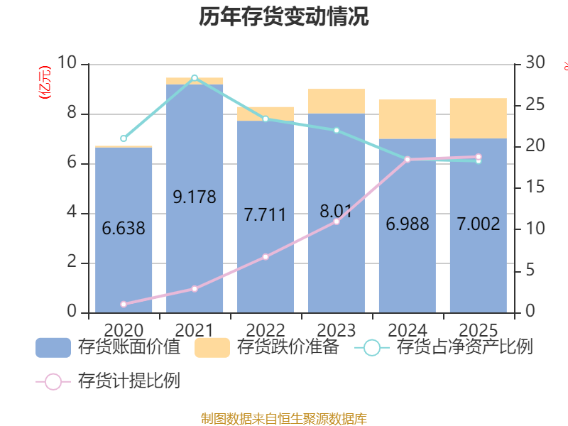 从存货变动来看,截至2025年末,公司存货账面价值为7亿元,占净资产的18.28%,较上年末增加143.24万元。其中,存货跌价准备为1.62亿元,计提比例为18.79%。